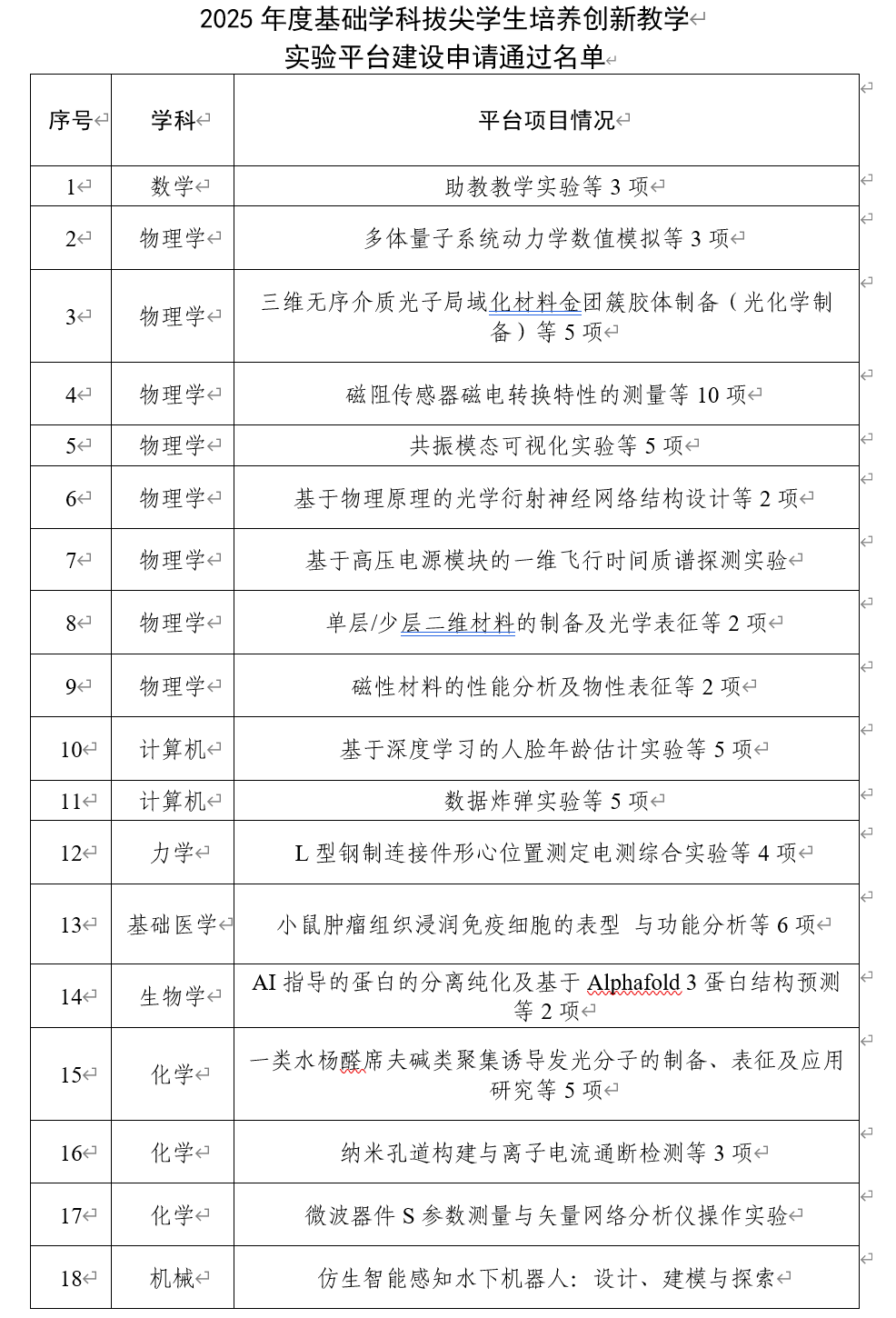 为进一步规范拔尖计划人才培养过程中的设备购置流程,充分发挥好教育教学改革经费的支撑作用,提升各试验班教学和科研训练条件,支持拔尖创新人才培养工作,钱学森学院开展了2025年度基础学科拔尖学生培养创新教学实验平台建设申请工作。经项目申报,专家评审,最终确定21个平台建设申请通过,现予以公示。